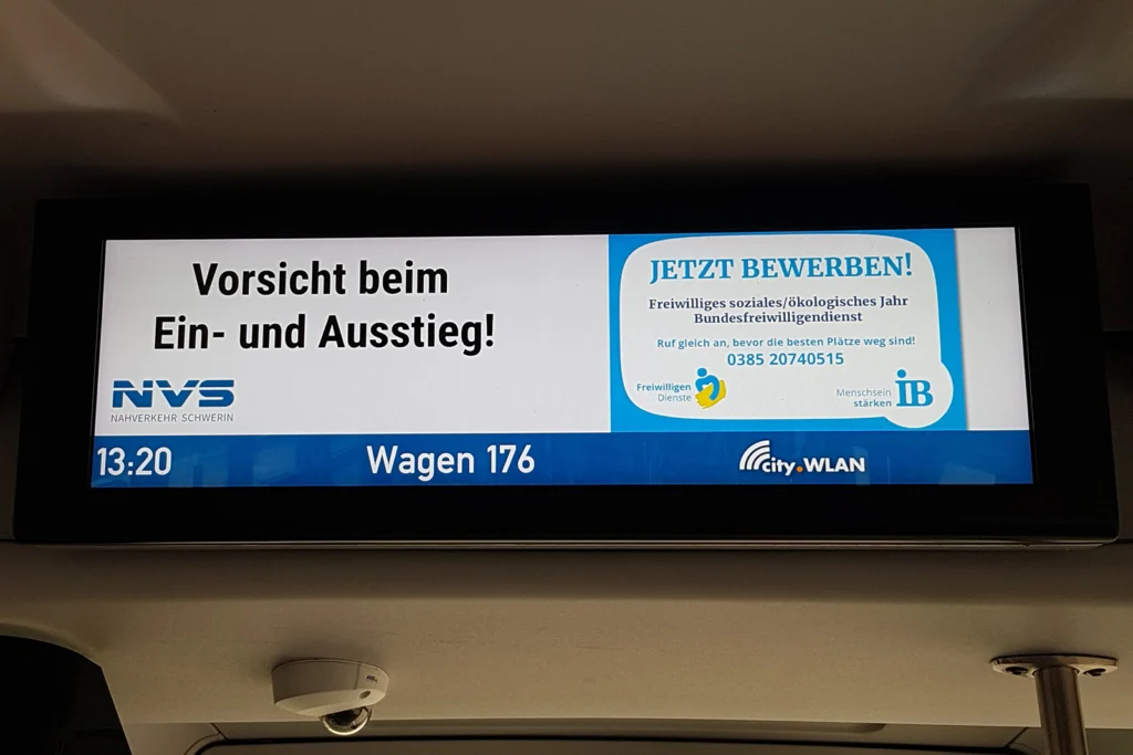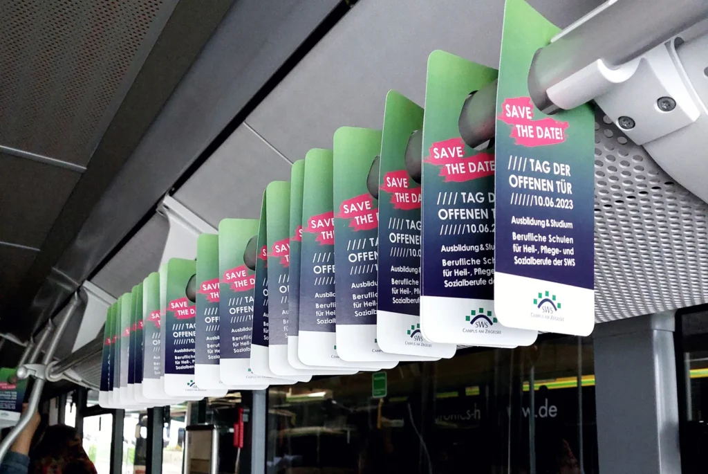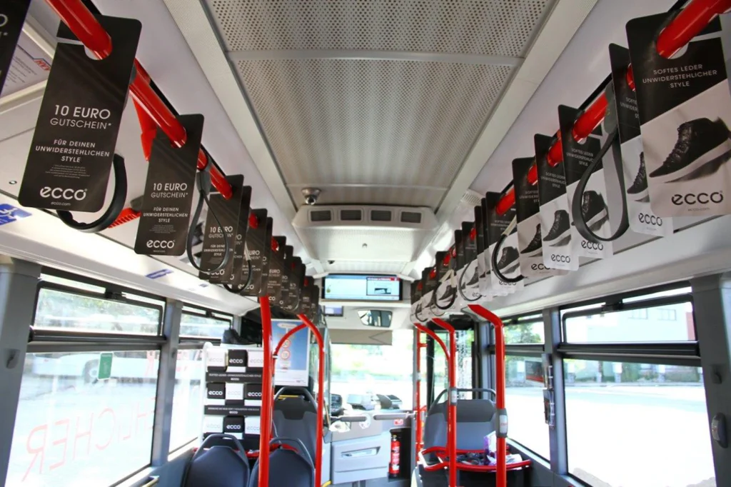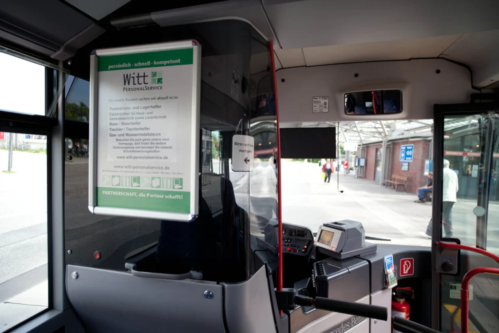 Im Innenraum von Bussen und Bahnen des ÖPNV finden Sie die ideale Plattform für Werbung. Vor allem die wiederkehrende Exposition auf Pendelstrecken fördert das Erinnern an Ihre Marke. Hier steht Ihnen eine breite Auswahl zur Verfügung: verwandeln Sie Swing Cards mit integriertem Gutschein zum idealen Response-Werbemittel, versehen Sie Seitenscheibenplakate mit einem SMS-Dienst für Gratis-Downloads oder schalten Sie Ihre Botschaft über Fahrgast TV in einem attraktiven Mix aus Information und Werbung. Wie auch immer, der Einsatzbereich ist groß – für alle kurzfristigen Aktionen oder Spot-Angebote bestens geeignet!